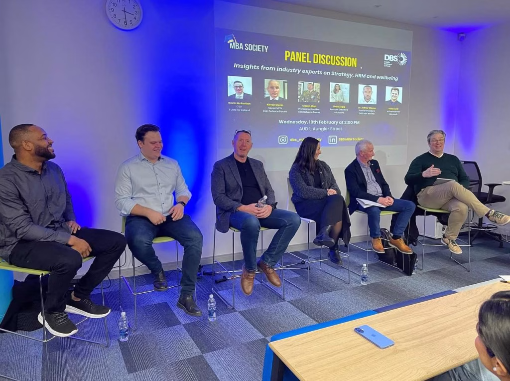 The panel discussion hosted by DBS’s MBA Society was designed to serve as a platform for knowledge exchange. With the session held in Auditorium 1 and led by lecturer Ray Whelan alongside MBA student leaders, the event created an environment conducive to active participation and learning. Panelists included influential figures from Microsoft Europe, the Irish military, and other key industries, providing students with firsthand insights into current industry trends and challenges.